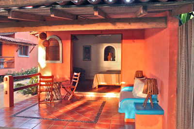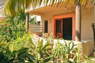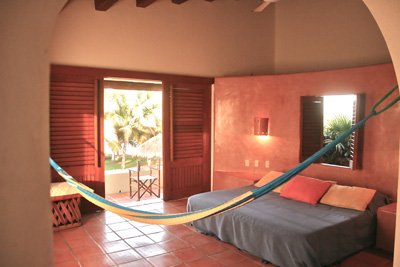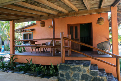 Bungalow 3 Enjoy spectacular ocean views from all rooms in this luxurious, romantic upper story unit. This unit features a large bedroom with a king size bed and hammock opening onto a balcony overlooking the pool. The indoor sitting area has a couch that can be used as a single bed. The shower is open air with pebble mosaic floors surrounded by a tropical garden for maximum privacy without blocking the ocean view. Price: US $120 per night for double occupancy See it... |
