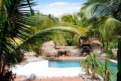 Bungalow 4 This bottom story unit overlooks the pool and tropical garden and features a large bedroom with a king size bed and hammock with a wide entrance to the sitting room which is great for reading and has a couch that can be used as a single bed. This unit also has a large closet area and semi enclosed shower surrounded by tropical gardens. Price: $120 per night for double occupancy See it... |